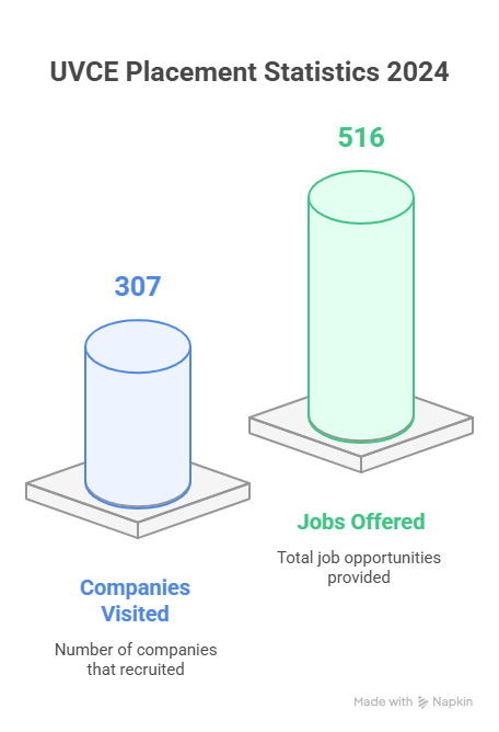 UVCE Placement Report 2025 has not been released yet. However, 307 recruiters participated in the placement drive, offering a total of 516 jobs in UVCE Placements 2024. Some of the top recruiters included Tally Solutions, Robert Bosch, Tesco, Avaya, Deutsche Bank, Ellucian, and Oracle, to name a few.