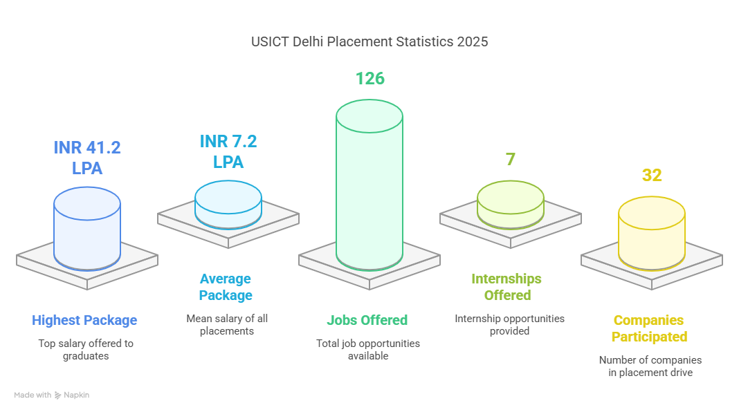 The USICT Placement Report for 2025 has not been released yet. However, in 2024, USICT witnessed the participation of 32 recruiters, extending 126 placement offers and 7 Internship Offers. The highest package was offered at INR 41.2 LPA, while USICT average package was recorded at INR 7.2 LPA. Numerous companies visited the campus, including Corning, Cvent, Zenon, ABInBev, TCS, Yamaha, etc.
