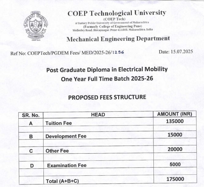COEP PG Diploma Electric Mobility is offered as 1 Year Full Time program, with total intake of 40 seats. The minimum eligibility criteria for PG Diploma is Graduation. The total fees for COEP PG Diploma Electric Mobility in 2025 is ₹ 1.75 Lakhs for the complete course duration, which includes total tuition fees of ₹ 1.75 Lakhs. Earlier, the fees in 2023 - 2024 for PG Diploma Electric Mobility was ₹ 1.5 Lakhs.