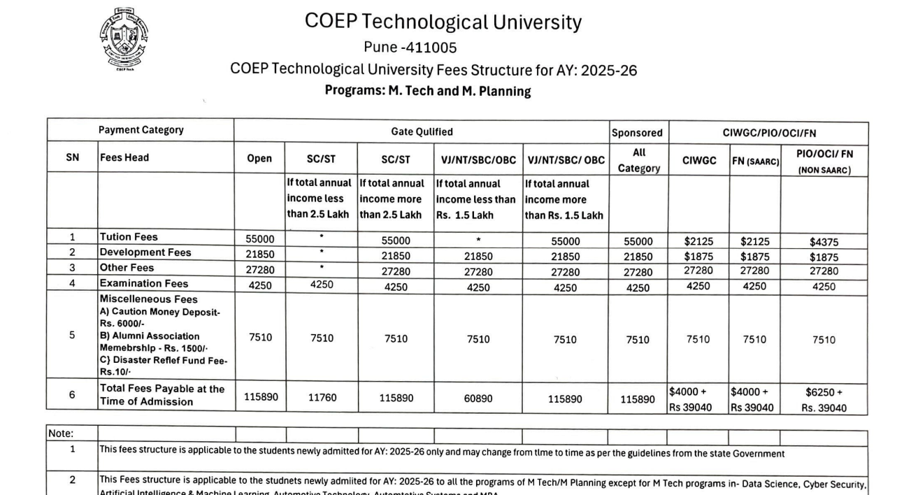 26 Jul, 2025 COEP M.Plan Town and Country Planning Fee structure 2025-26 has been released. The total academic fee is ₹ 2.24 Lakhs.