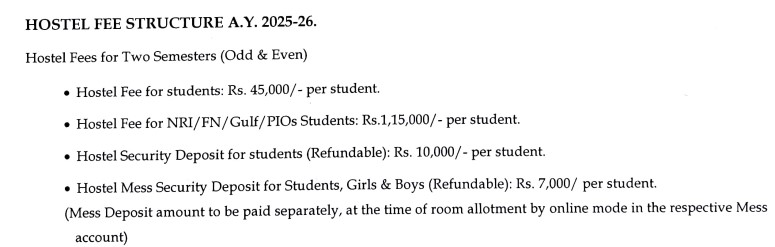 The girls' hostel is a modern 11-story building, while the boys' hostels are older. Each hostel has a dedicated mess, with meals costing around Rs. 2,200 to Rs. 4,000 monthly, offering vegetarian and non-vegetarian options, including special meals on Sundays. Hostel life is generally rated positively for its affordability and community atmosphere, despite some complaints about food variety and cleanliness. Additional facilities include a gym, dispensary, and security, with separate blocks for each academic year and gender.