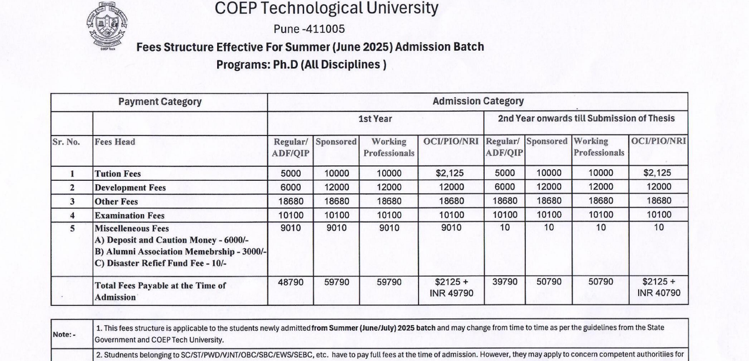 26 Jul, 2025 COEP has released the Fee structure 2025-26 for Ph.D Electronics and Telecommunication programs. The academic fee is ₹ 48,790 /Yr.