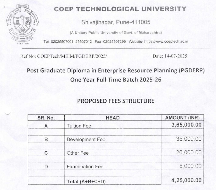 COEP PG Diploma Enterprise Resource Planning Systems Fees 2025