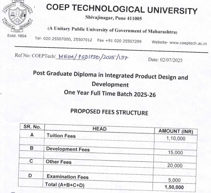 COEP PG Diploma Product Design is offered as 1 Year Full Time program, with total intake of 20 seats. The minimum eligibility criteria for PG Diploma is Graduation. The total fees for COEP PG Diploma Product Design in 2025 is ₹ 1.5 Lakhs for the complete course duration, which includes total tuition fees of ₹ 1.5 Lakhs. Earlier, the fees in 2023 - 2024 for PG Diploma Product Design was ₹ 1.89 Lakhs.