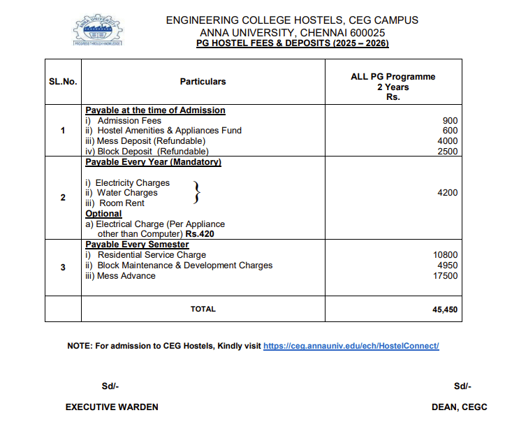 - CEG Guindy Hostel Fee is ₹ 40,070.
