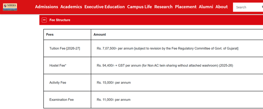 The 2-year MBA program costs around Rs. 14 to 16 lakhs, inclusive of tuition, hostel, and amenities, with annual MBA-FT fees at approximately Rs. 7.5 lakhs. Fees rise yearly, influenced by GST. Scholarships based on merit can offer up to Rs. 1 lakh per year, and financial aid and easy loans are available. First-year fees are Rs. 5.4 lakhs, split into two installments, with Rs. 1.2 lakhs for hostel fees and an extra Rs.