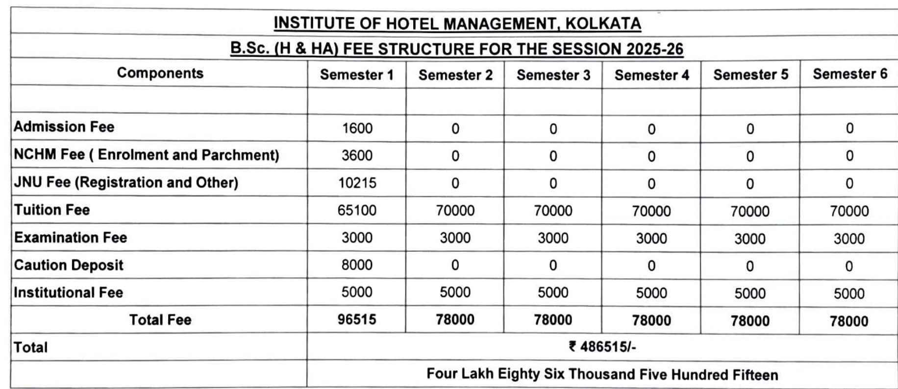 Earlier, B.Sc(HHA) Hospitality And Hotel Administration fees at IHM Kolkata was ₹ 3.38 Lakhs (in 2024) for the entire course duration. This shows a fee increase of ₹ 1.49 Lakhs over the year.