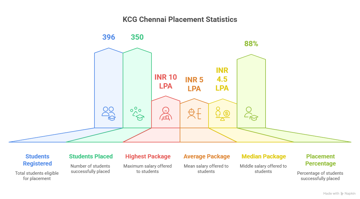 KCG Chennai Placements 2025 are currently ongoing. Till now, 350 students out of 396 registered students have been placed. The college has achieved a placement percentage of 88%. KCG College of Technology highest package was offered at INR 10 LPA, while KCG College of Technology average package stood at INR 5 LPA. Leading organisations like Accenture, Cognizant, Ashok Leyland, JustDial, Hexaware and IBM were some of the top recruiters here.
