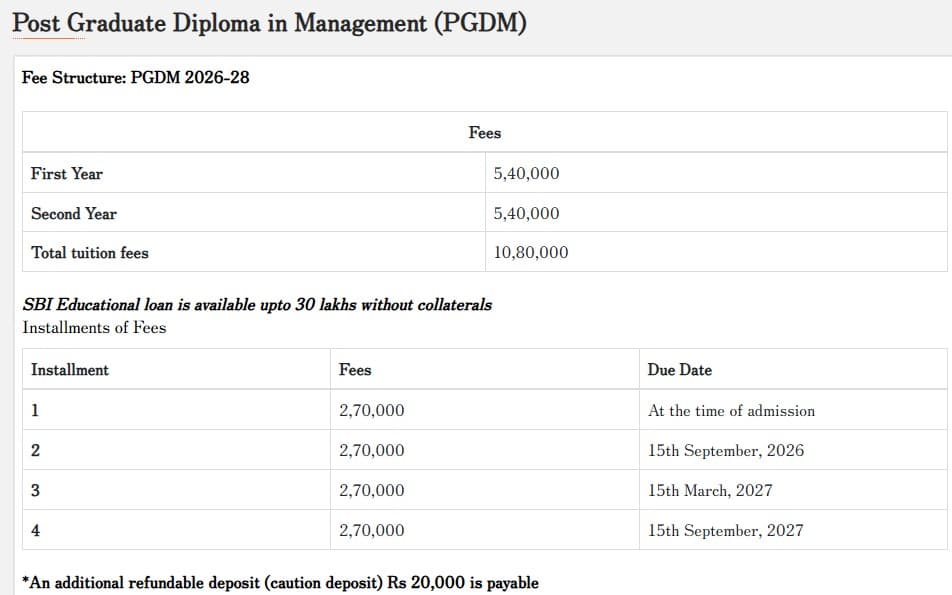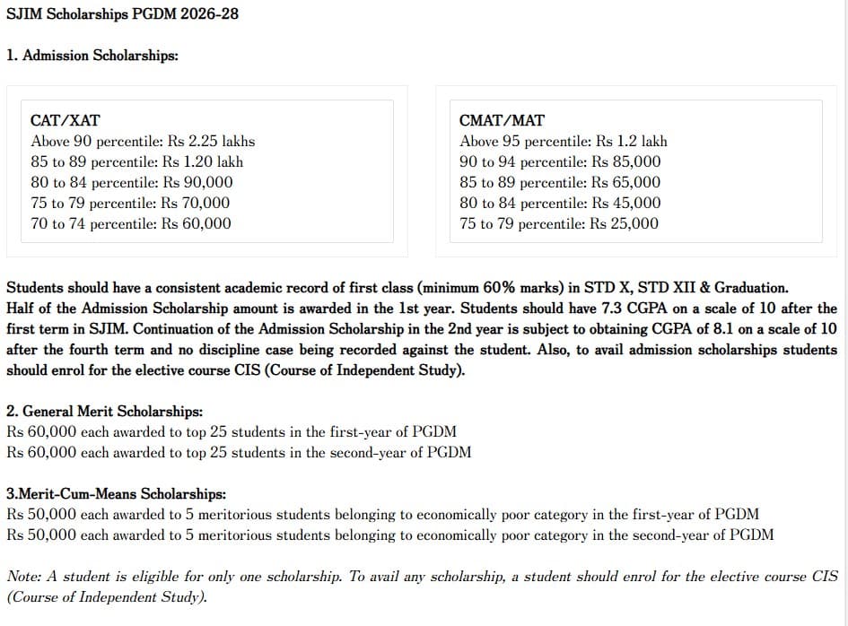 SJIM, located on MG Road in Bangalore, is known for its excellent infrastructure and experienced faculty. Admission includes an essay test, interviews, and an Entrance Exam. The total course fee is approximately Rs. 8 to 8.4 lakhs for two years, with annual fees around Rs. 3.9 lakhs. Hostel fees range from Rs. 60,000 to Rs. 90,000, covering breakfast and dinner. Scholarships are available based on merit, entrance scores, and need, with fee concessions for students from families earning below Rs.