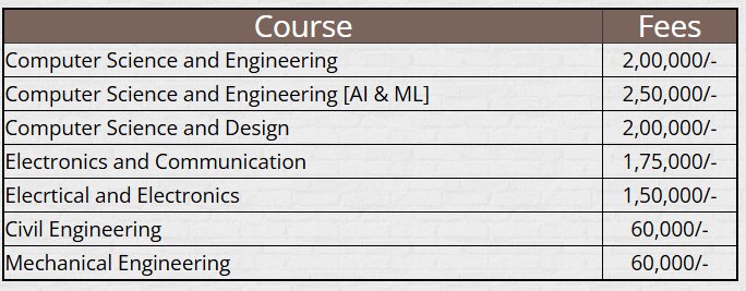| Fees (2025 - 2026) | Year 1 (in INR) | Year 2 (in INR) | Year 3 (in INR) | Year 4 (in INR) |