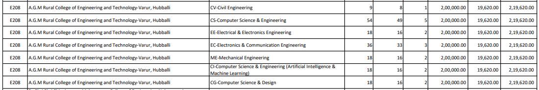 AGM Rural College of Engineering and Technology Hubli BE Computer Science And Engineering is offered as 4 Years Full Time program, with total intake of 180 seats. The minimum eligibility criteria for BE is 10+2 with 45% + KCET. The total fees for AGM Rural College of Engineering and Technology Hubli BE Computer Science And Engineering in 2025 is ₹ 8 Lakhs for the complete course duration, which includes total tuition fees of ₹ 8 Lakhs. Earlier, the fees in 2024 - 2025 for BE Computer Science And Engineering was ₹ 8 Lakhs.
