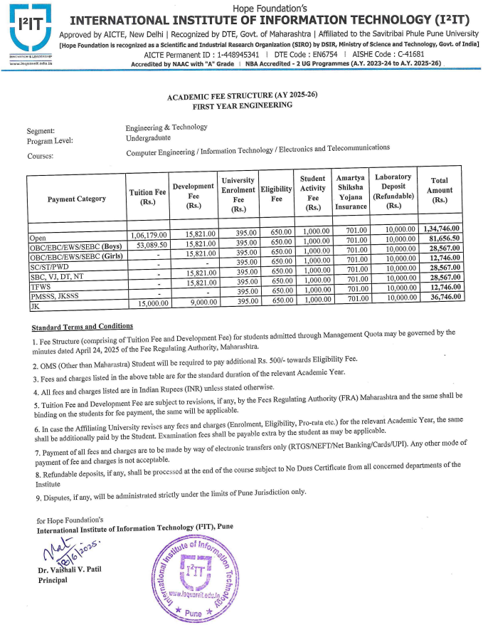 - I²IT Pune Hostel Fee is ₹ 78,860.