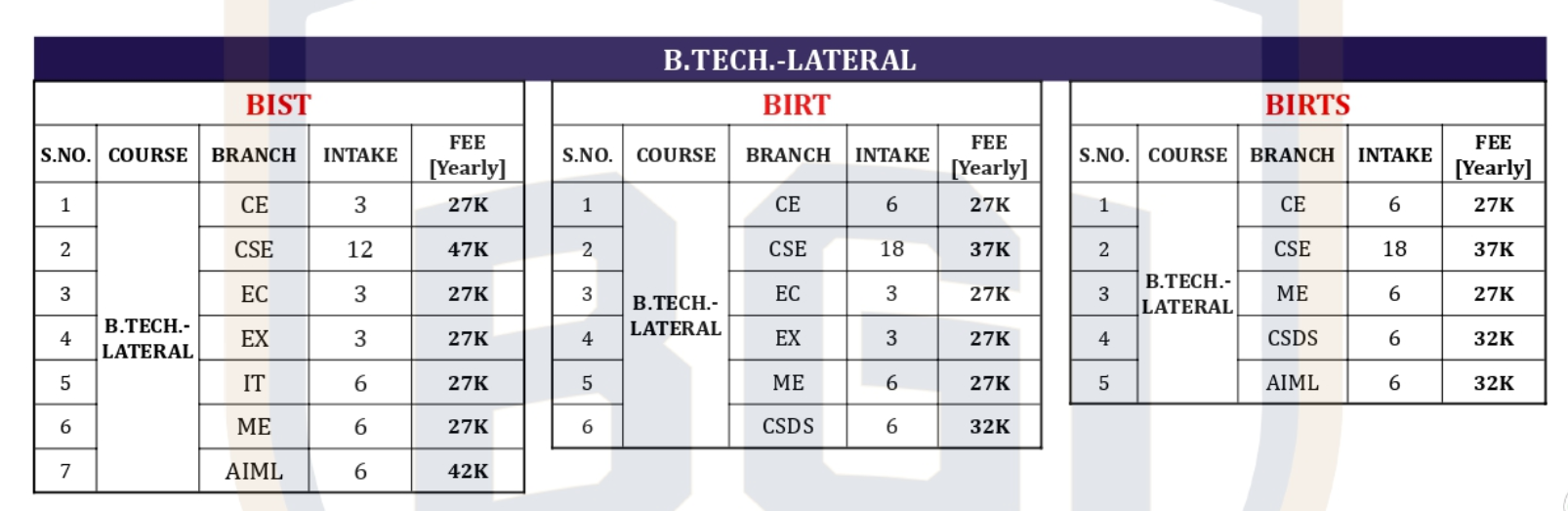 B.Tech {Lateral} Information Technology at Bansal Institute of Science and Technology Bhopal is a 3 Years Degree. The course is offered On Campus as a Full Time program. Bansal Institute of Science and Technology Bhopal B.Tech {Lateral} Information Technology First Year Fees is INR 27,000 for 2025.