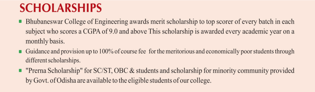 The minimum eligibility for admission to B.Tech {Lateral} Civil Engineering at Bhubaneswar College of Engineering Khorda is Diploma with 45% + OJEE. Candidates are allotted seats based on OJEE.
