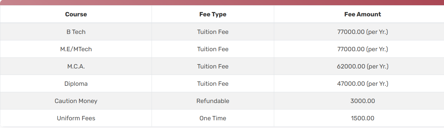 | Fees (2025 - 2026) | Year 1 (in INR) | Year 2 (in INR) | Year 3 (in INR) | Year 4 (in INR) |