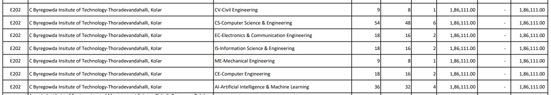 C Byregowda Institute of Technology Kolar KCET Cutoff 2023 rank is 96292 - 126002 for the 1G category. Further, the cutoff rank is 112059 - 135593 for 1R category, 106908 - 110941 for 2AG category, Earlier, the KCET cutoff rank 2022 was 105267 - 161561 for the 1G category.