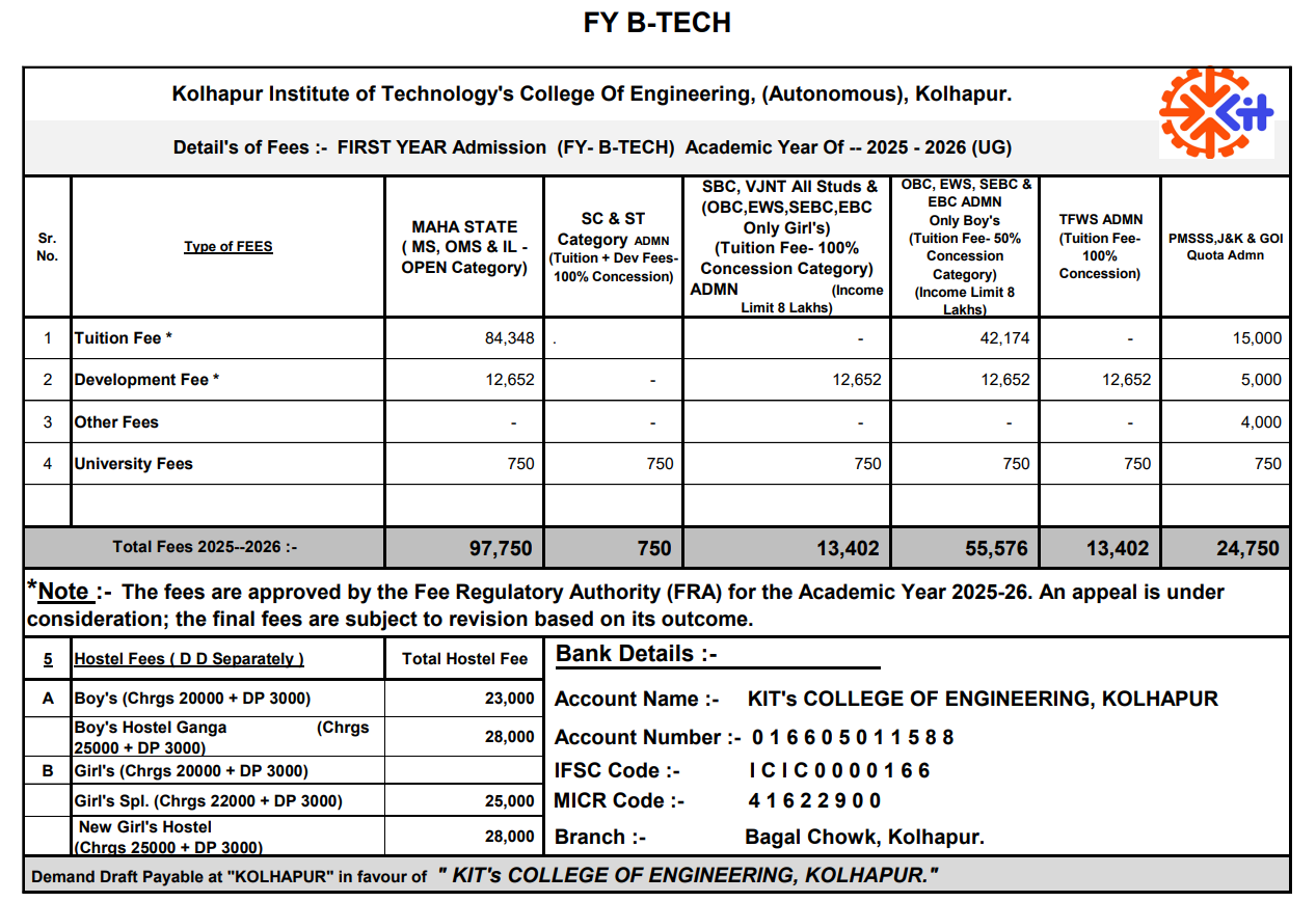 SC/ST students have a nominal fee of 750 rupees per year. Scholarships are available for economically weaker sections, defense candidates, and via the MahaDBT portal. The college supports higher education pursuits post-B.Tech and does not increase fees annually. Special provisions are made for students from Jammu and Kashmir.