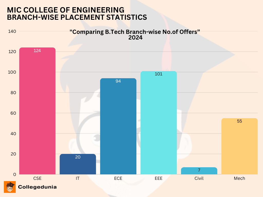 MIC College of Technology has not released the official 2025 placement report yet. However, in recent years, a total of 756 offers were placed with an 85% placement record, and the highest salary package offered was INR 20 LPA; the average package was INR 4.25 LPA. The top recruiters during placement 2024 are Genpact, Infosys, Wipro, Capgemini, TCS, Accenture, and Cognizant. MIC College of Technology Placement branch-wise number of offers in 2024 is shown below in the infographic.