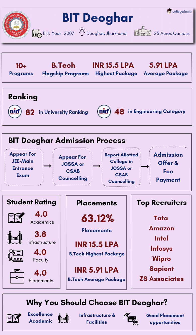During the BIT Deoghar placements 2024, the highest salary package offered was 15.5 LPA, with an average salary package of 5.91 LPA. The placement percentage stood at 63.12%. Top recruiters at BIT Deoghar are Tata, TISCO, Amazon, Intel, Infosys, Wipro, Cognizant, Sapient, Havells, ZS Associates, Reliance Jio, Vedanta, TATA Communications, Microsoft, and Google etc.