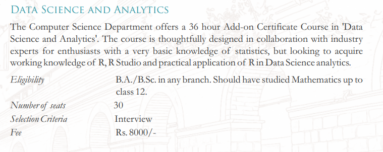 Miranda House Certification Data Analytics is offered as 4 Months Full Time program, with total intake of 30 seats. The minimum eligibility criteria for Certification is Graduation. The total fees for Miranda House Certification Data Analytics in 2025 is ₹ 8,000 for the complete course duration.