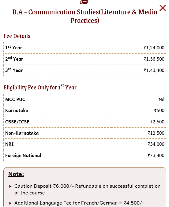 Students can participate in internships and are eligible for placements after their third year. The course fees for Honours in Communication Studies, one of the costliest, start at 1,08,000 INR annually, increasing to 1,13,500 INR by the third year, with an average yearly fee between 1,13,000 INR and 1,16,000 INR. Non-Karnataka first-year students pay an additional 15,000 INR. Lab fees are around 3,000 INR yearly, offering access to two labs.