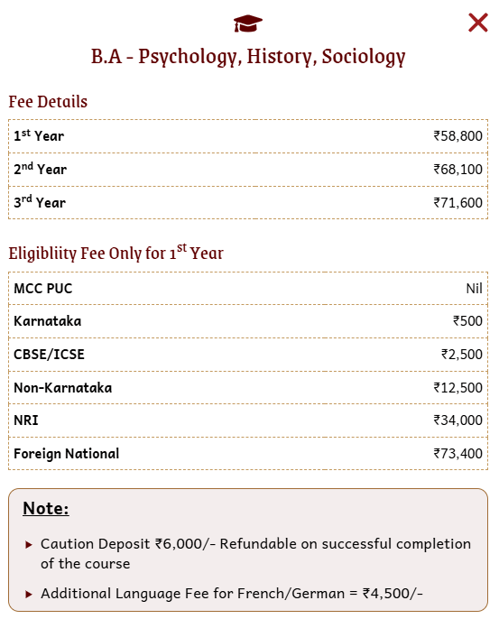 Tuition fees for BA courses are under Rs. 1 lakh annually, with variations such as Rs. 90,000 for the first year and Rs. 85,000 for the second year. Additional fees apply for foreign language classes. The college offers scholarships for students in need. Tuition can be paid in installments, with structures like an initial payment of Rs. 55,000 and a balance of Rs. 32,000. Late payments incur fines. The college is known for its supportive environment towards students facing difficulties.