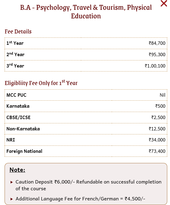 Earlier, BA Travel and Tourism fees at Mount Carmel College Autonomous was ₹ 2.99 Lakhs (in 2025) for the entire course duration. This shows that the fee has remained unchanged since 2025.