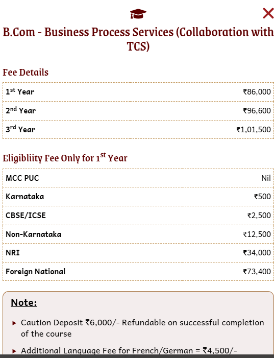 The admission process at the college is well-organized, requiring an application form and adherence to the cut-off. Students with a PUC from MCC find the process smoother. The faculty is highly praised with a perfect score of 5/5 for being approachable and supportive, allowing students to freely seek help. Fees vary by course but are on par with other colleges. The institution provides strong placement opportunities, with over 30 companies like Deloitte, KPMG, TCS, Goldman Sachs, ICICI Bank, Accenture, and HDFC Bank recruiting on campus.