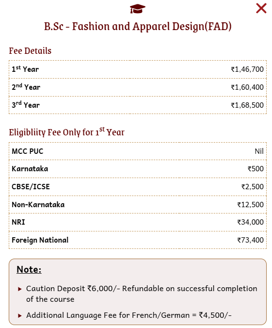 Prominent companies like Accenture, Starbucks, TCS, Prestige, JP Morgan, Koskii, and Goldman Sachs regularly recruit from the program. Internships are available for students at apparel production units like Arvind, Nykaa, Wonder Blues, and Shahi Exports, lasting one month after the 4th semester and are faculty-guided. The placement process is well-structured and supported by faculty mentorship. The Bachelor of Science in Fashion Design program costs 1.2 lakh INR per year, payable by semester.
