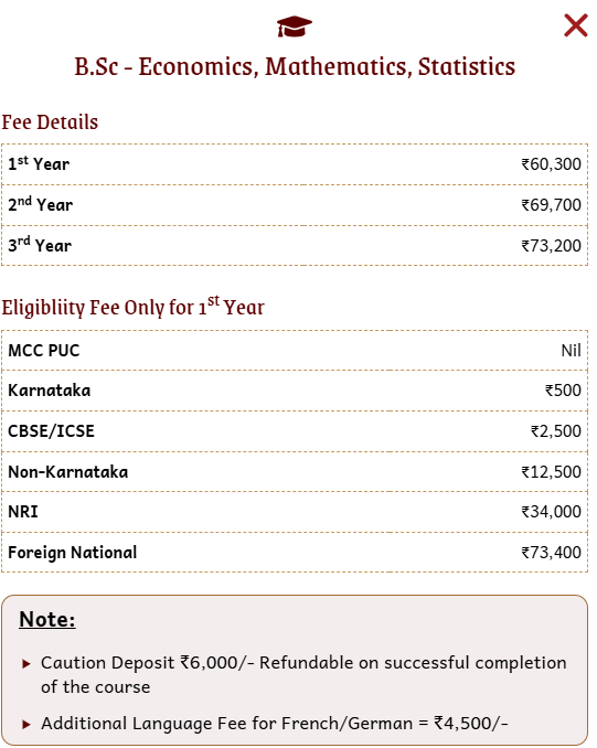 Earlier, B.Sc Statistics fees at Mount Carmel College Autonomous was ₹ 3.72 Lakhs (in 2025) for the entire course duration. This shows a fee decrease of ₹ 1.5 Lakhs over the year.