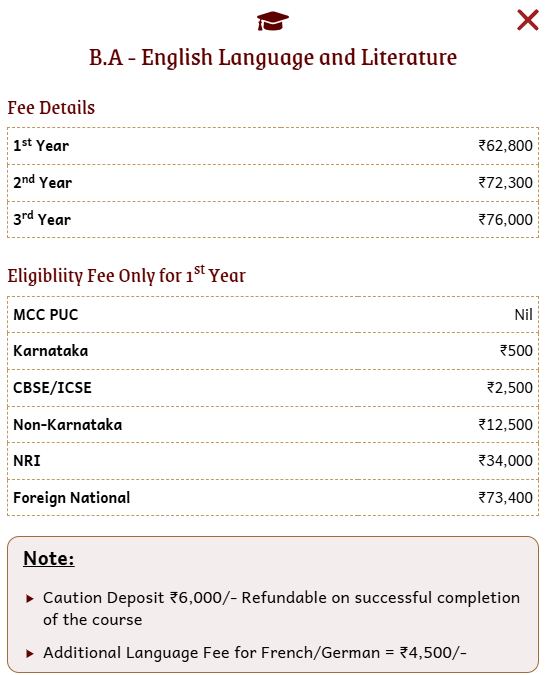 Earlier, BA English Literature fees at MCC Bangalore was ₹ 1.31 Lakhs (in 2024) for the entire course duration. This shows a fee increase of ₹ 1.27 Lakhs over the year.