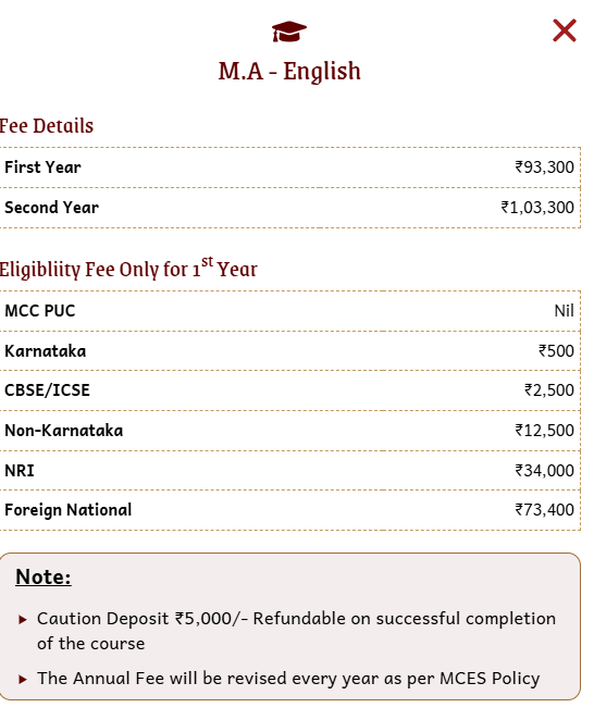 Earlier, MA English fees at Mount Carmel College Autonomous was ₹ 2.21 Lakhs (in 2025) for the entire course duration. This shows a fee decrease of ₹ 7,100 over the year.