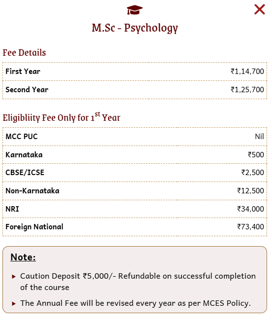Earlier, MA Psychology fees at Mount Carmel College Autonomous was ₹ 2.21 Lakhs (in 2025) for the entire course duration. This shows a fee increase of ₹ 36,700 over the year.