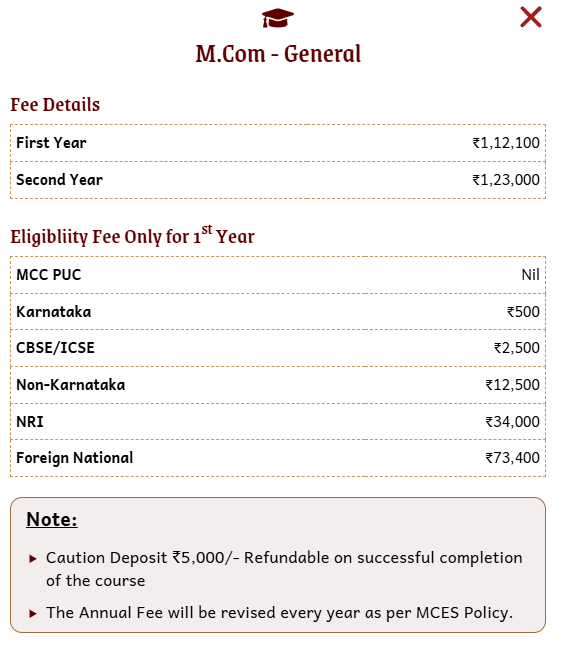 Earlier, M.Com fees at Mount Carmel College Autonomous was ₹ 2.71 Lakhs (in 2025) for the entire course duration. This shows a fee decrease of ₹ 18,000 over the year.