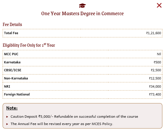 Earlier, M.Com E-Commerce fees at Mount Carmel College Autonomous was ₹ 1.22 Lakhs (in 2025) for the entire course duration. This shows that the fee has remained unchanged since 2025.