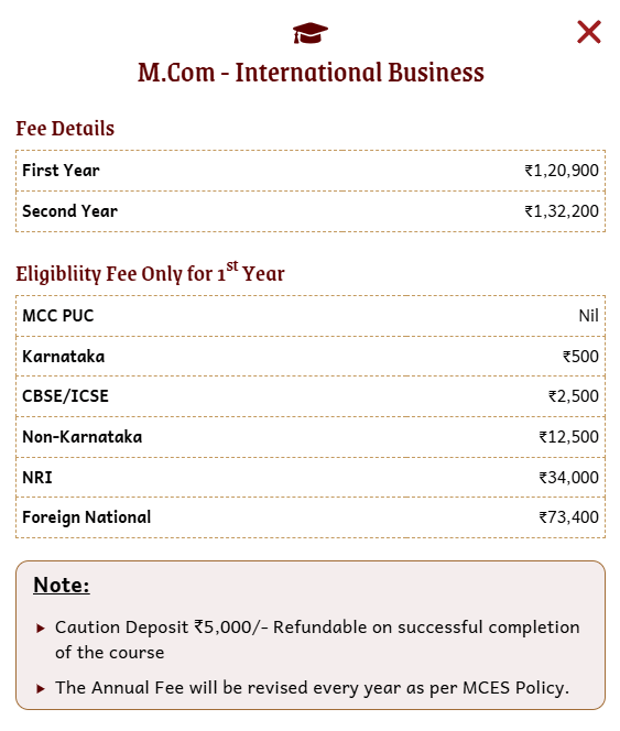 Earlier, M.Com International Business fees at Mount Carmel College Autonomous was ₹ 2.71 Lakhs (in 2025) for the entire course duration. This shows that the fee has remained unchanged since 2025.