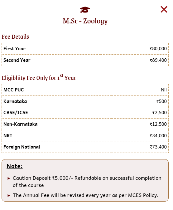 Earlier, M.Sc Zoology fees at Mount Carmel College Autonomous was ₹ 1.69 Lakhs (in 2025) for the entire course duration. This shows that the fee has remained unchanged since 2025.