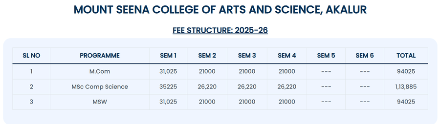 Mount Seena College of Arts and Science Akalur Palakkad M.Com Finance fees in first year is ₹ 57,145. The detailed fees is mentioned below.