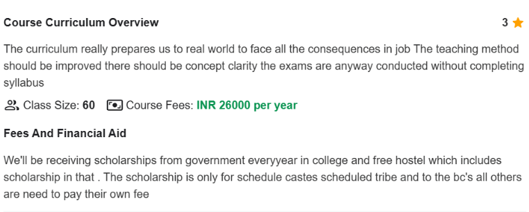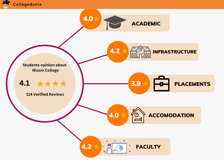 Based on students’ reviews on Collegedunia, Nizam College Hyderabad bags a 4.2 rating out of 5 in Infrastructure and Faculty. Scoring 4 points in the Academic stream and 3.9 in the Placements Category, Nizam College rules the heart of our Students. Nizam College Hyderabad is not less in Accommodation Stream. It Bags an excellent rating of 4 out of 5.