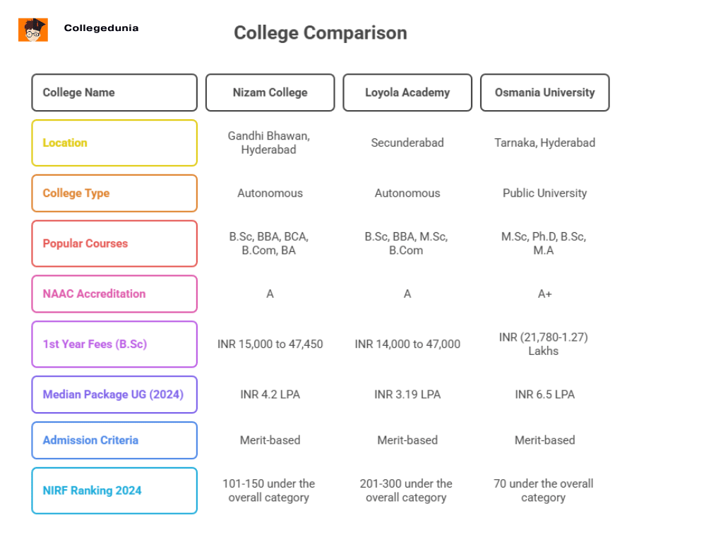 | Particulars | Nizam College | Loyola Academy | Osmania University |