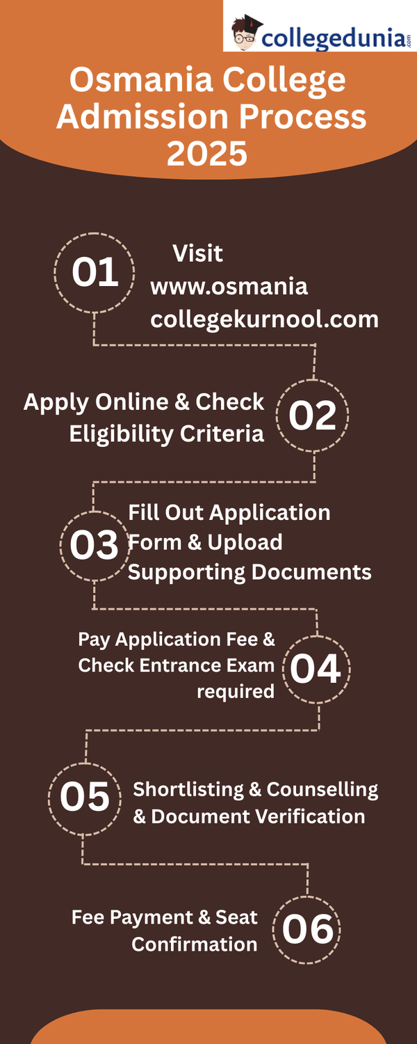 The admission process at Osmania College, Kurnool, requires one to apply online via the official website, complete the online registration and profile creation, fill out the application form, and pay the application fee. Admissions are generally merit-based, though some courses may require you to qualify in specific university or state-level entrance exams like BIEAP or others. After being shortlisted, you'll need to complete document verification and pay the tuition fee to confirm your seat.