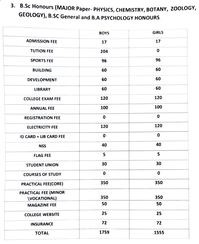 The college fee for a bachelor's degree is about 2,000 INR per year, with the first-semester admission fee for general students around 2,600 INR. OBC and SC/ST students benefit from reduced costs, and scholarships are available for meritorious students. The college does not offer undergraduate placement services, but postgraduate courses like M.Sc and M.Com have placement facilities. Bachelor of Science in Geology graduates must seek opportunities independently. The annual fee for science students is approximately 30,000 INR, with a detailed breakdown of tuition, registration, admission, and lab fees.