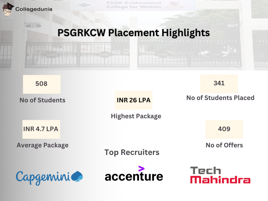 The official placement 2025 report for PSGRKCW is yet to be released. In the recent placement drive, a total of 508 students applied for jobs. Out of them, 341 students were placed. The college received 409 job offers in total. The average salary offered was INR 4.7 LPA, while the highest package reached up to INR 26 LPA.