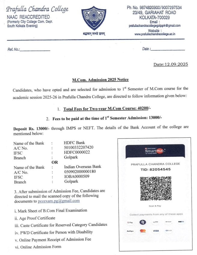 15 Oct, 2025 Prafulla Chandra College Kolkata M.Com Fee Structure 2025-26 has been released. The total academic fee is ₹ 40,200 .