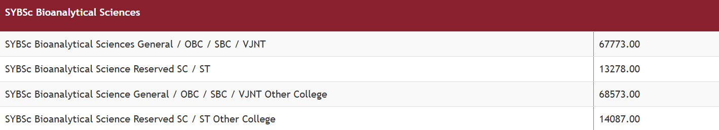 Ramnarain Ruia Autonomous College Mumbai B.Sc Bioanalytical Sciences is offered as 3 Years Full Time program. The minimum eligibility criteria for B.Sc is 10+2 with 50%. The total fees for Ramnarain Ruia Autonomous College Mumbai B.Sc Bioanalytical Sciences in 2025 is ₹ 1.97 Lakhs for the complete course duration, which includes total tuition fees of ₹ 1.97 Lakhs. Earlier, the fees in 2024 - 2025 for B.Sc Bioanalytical Sciences was ₹ 1.9 Lakhs.