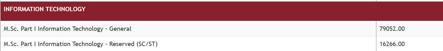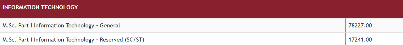 Ramnarain Ruia Autonomous College Mumbai M.Sc Information Technology is offered as 2 Years Full Time program. The minimum eligibility criteria for M.Sc is Graduation with 50%. The total fees for Ramnarain Ruia Autonomous College Mumbai M.Sc Information Technology in 2025 is ₹ 1.57 Lakhs for the complete course duration, which includes total tuition fees of ₹ 1.57 Lakhs. Earlier, the fees in 2024 - 2025 for M.Sc Information Technology was ₹ 1.52 Lakhs.