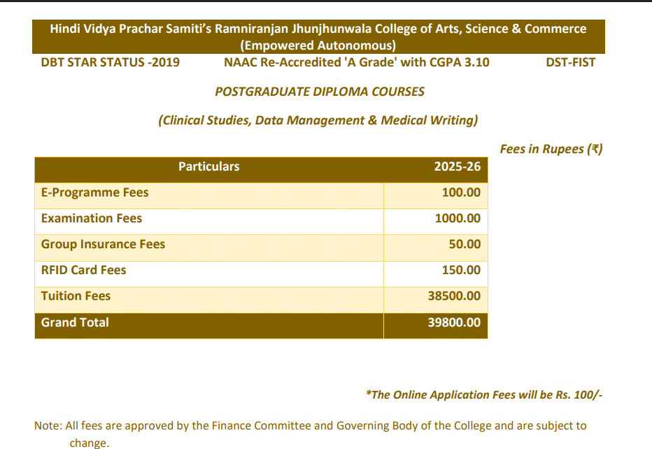 RJC PG Diploma Clinical Data Management fees 2025 is ₹ 39,800 for the entire course duration.