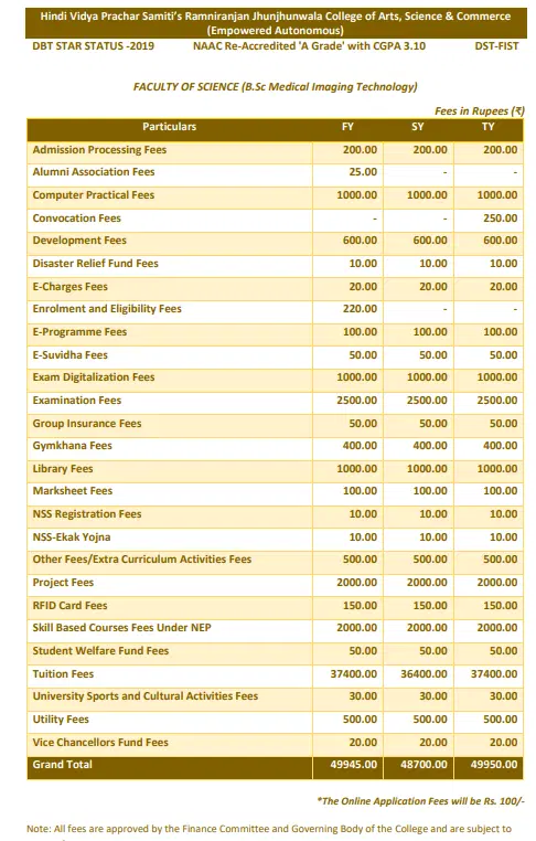 RJC B.Sc Medical Imaging Technology fees 2025 is ₹ 1.49 Lakhs for the entire course duration.