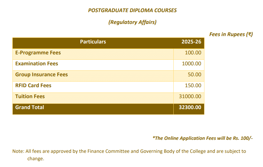 RJC PG Diploma Drug Regulatory Affairs fees 2025 is ₹ 32,300 for the entire course duration.