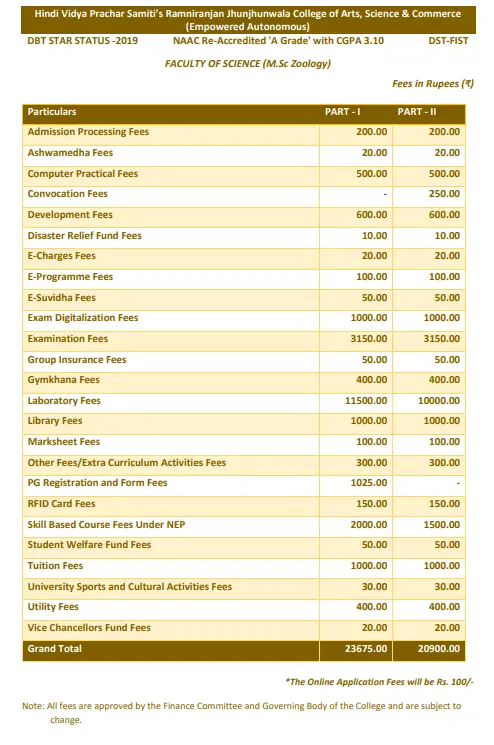 Scholarships, including the DST scholarship for Zoology students, are offered, and government scholarships are accepted. The detailed fee structure includes tuition fees of 500 INR, examination fees of 500 INR, and other minor charges totaling approximately 1,100 INR. The college office staff is supportive, with specific duties related to scholarships.
